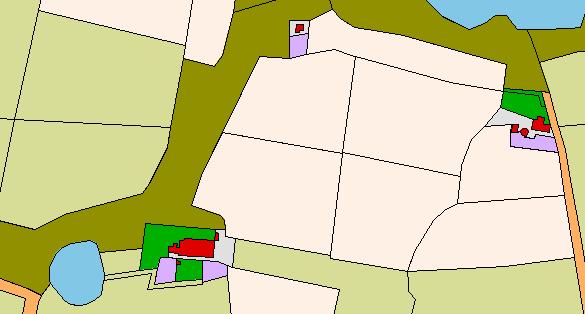 Kaart van rond 1832 (Hisgis). Links de boerderij bij de kolk aan het oude tracé van de Oldijk (uiterst links onder), bovenaan het huisje van Pieter Kornelis Bootsman en rechts de huidige Schoorsterweg met de (afgebroken) molen en de molenaarswoning.