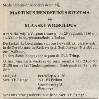 Direct na hun huwelijk gingen Martinus en Klara wonen op Oldijk 5a, dat al bijna een jaar leeg stond. Vanwege deze plannen werd Oldijk 8 al in mei 1986 te koop aangeboden:
