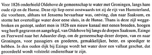 “Ook het tot stand brengen van eene direkte scheepvaart van de dorpen Oldehove, Niehove, en Saaxum op Groningen, en het daardoor aanmerkelijk verminderen der zijlschotten onder het Saaxumer Zijlvest, waartoe reeds overlang de wenschen der ingezetenen zich uitstrekken, nadert deszelfs rijpheid, en eene voordragt daartoe schijnt weldra aan Onze overweging te zullen worden aangeboden.”